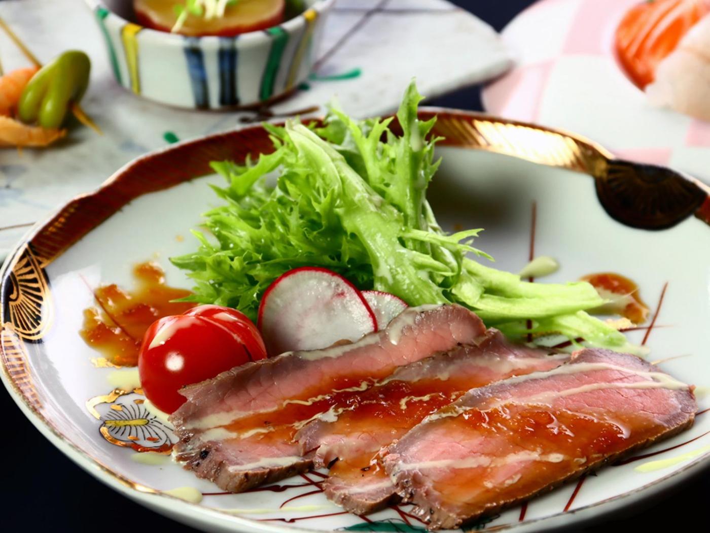 A traditional multi-course meal is served for dinner and a Japanese set-menu for breakfast. Dishes are prepared with seasonal ingredients and served at the dining room.