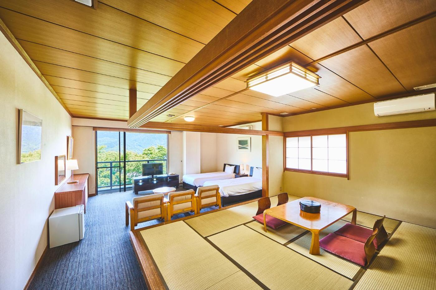 Room Selected at Check-In. The twin room offers air conditioning, a seating area, as well as a shared bathroom featuring a hairdryer and slippers. The twin room provides a safe deposit box, an electric kettle, yukata, heating and a flat-screen TV. The unit offers 2 beds. ;