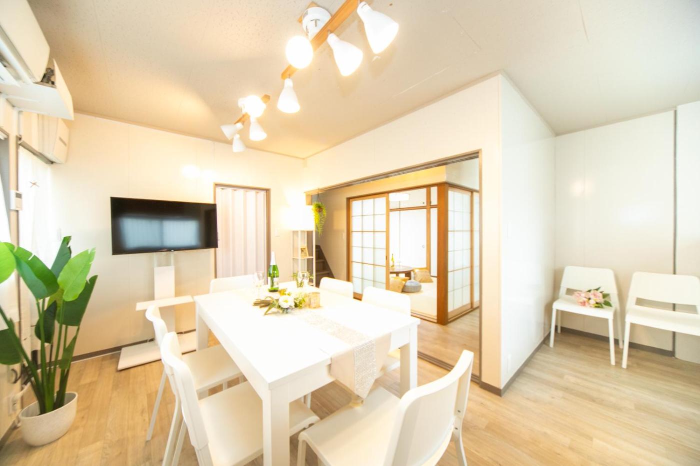Four-Bedroom House. This holiday home features a hot tub. Meals can be prepared in the well-fitted kitchen, which has a stovetop, a refrigerator, kitchenware and a microwave. The spacious holiday home features air conditioning, a washing machine, tatami, a dining area, as well as a flat-screen TV. The unit has 7 beds and 4 futons.