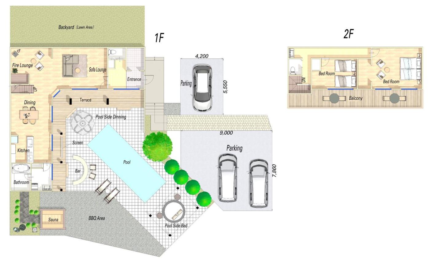 Two-Bedroom Villa. This luxurious villa features a private pool, a hot tub and a sauna. Boasting a private entrance, this air-conditioned villa comes with 1 living room, 2 separate bedrooms and 1 bathroom with a bath and a shower. Guests will find a stovetop, a refrigerator, a dishwasher and a microwave in the kitchen. The villa also includes a barbecue. The villa has a washing machine, a minibar, a tea and coffee maker as well as a balcony with pool views. The unit has 4 beds and 2 futons.