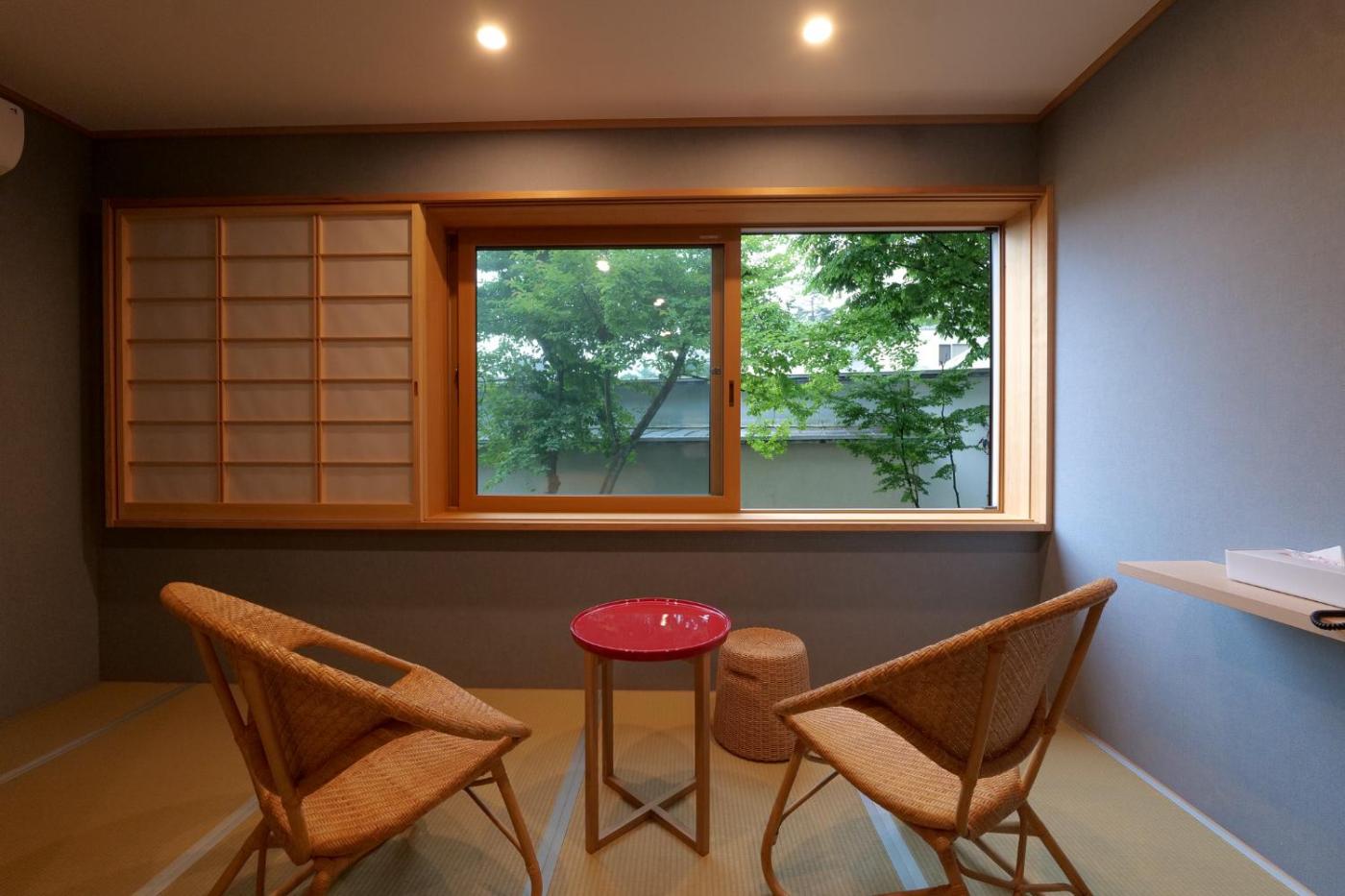 Japanese Style room with Futon. Tranquil room featuring a tatami (woven-straw) floor, shoji sliding paper screens and a low table with seating cushions. It has a seating area with a coffee table and chairs, traditional futon bedding and an attached toilet. Amenities include an LCD TV, a fridge and toiletries. Bathing facilities are shared. ;