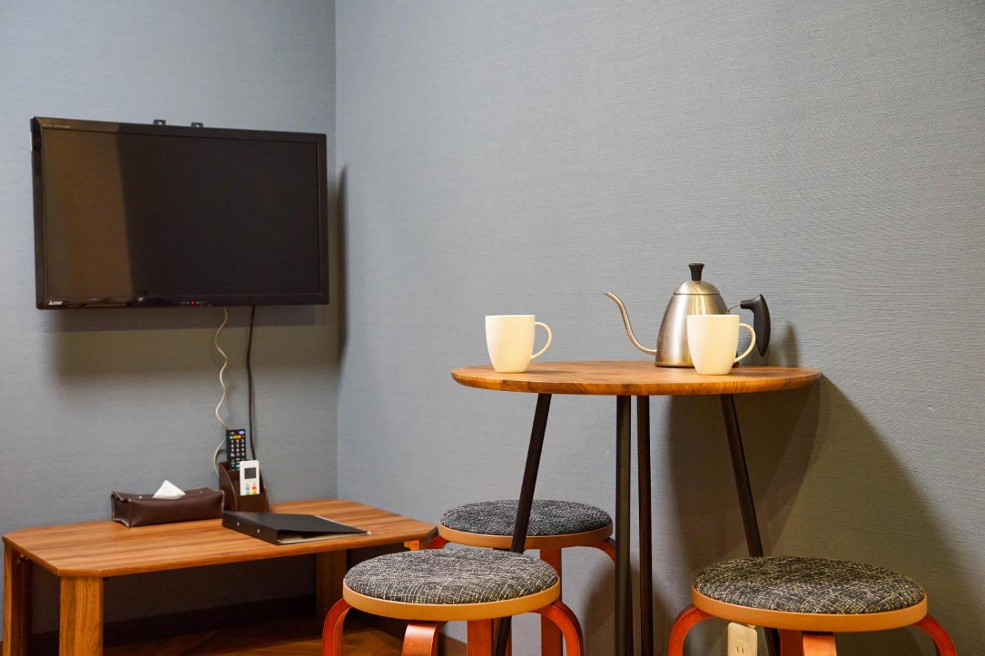 Large Room - Second Floor. This private room features a mix of Japanese-style and Western decor and is located on the second floor. The kitchen is equipped with a refrigerator, microwave, electric kettle and kitchenware. The private bathroom has bath amenities and towels.