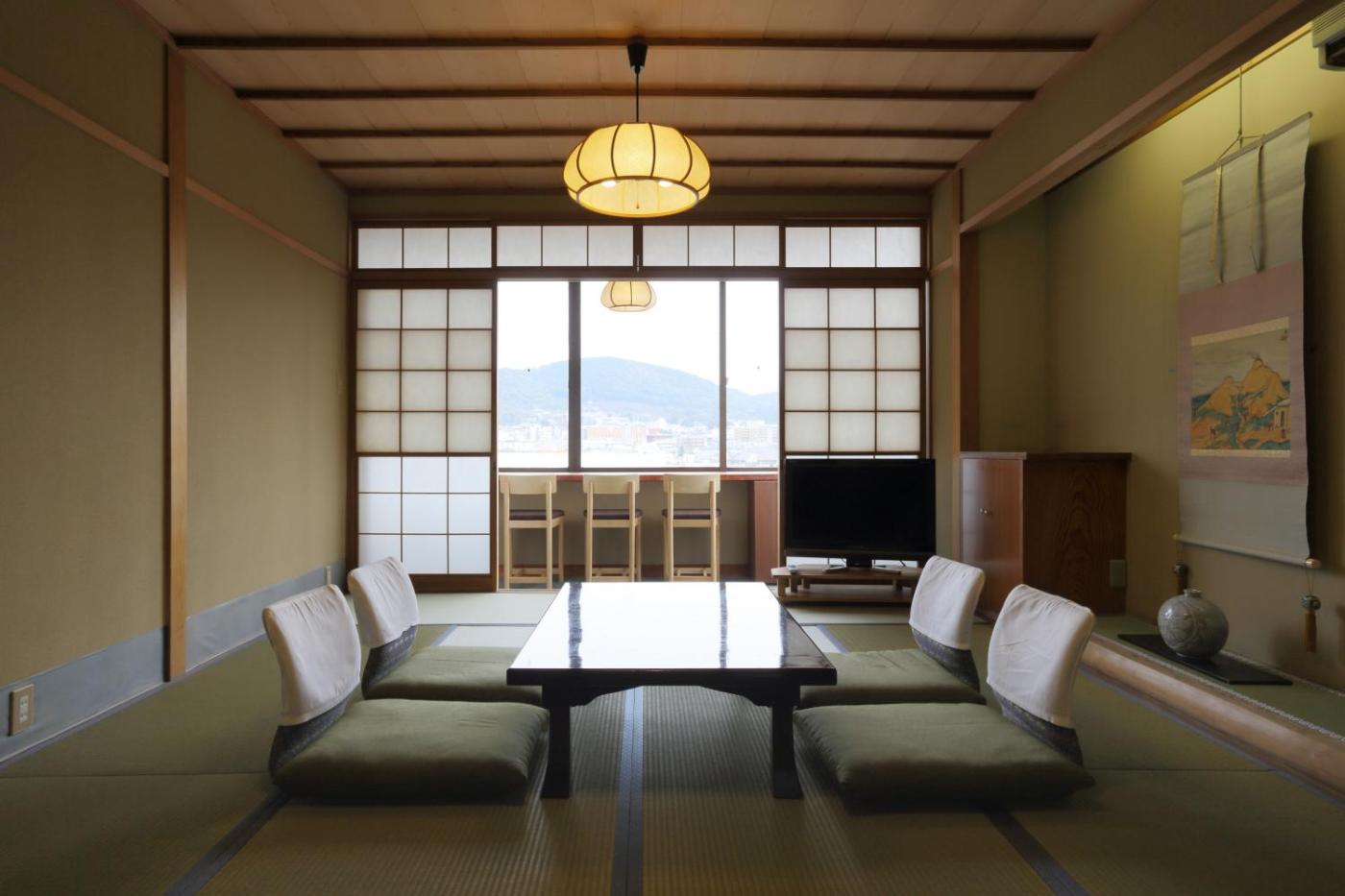 Japanese-Style Quadruple Room. Offering a historic charm, each room comes with tatami (woven-straw) flooring, a low table and futon bedding. Guests can unwind in the room with a yukata robe on, while watching satellite channels on a flat-screen TV. Room features Kamogawa River views. ;