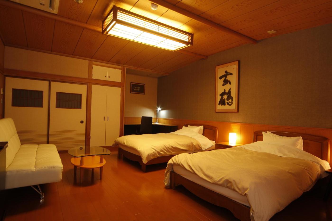 At Tsukino Shizuka Ryokan, some rooms are fitted with tatami (woven-straw) flooring and futon bedding, while others come with Western beds. Air conditioning and a flat-screen TV are included inrooms.