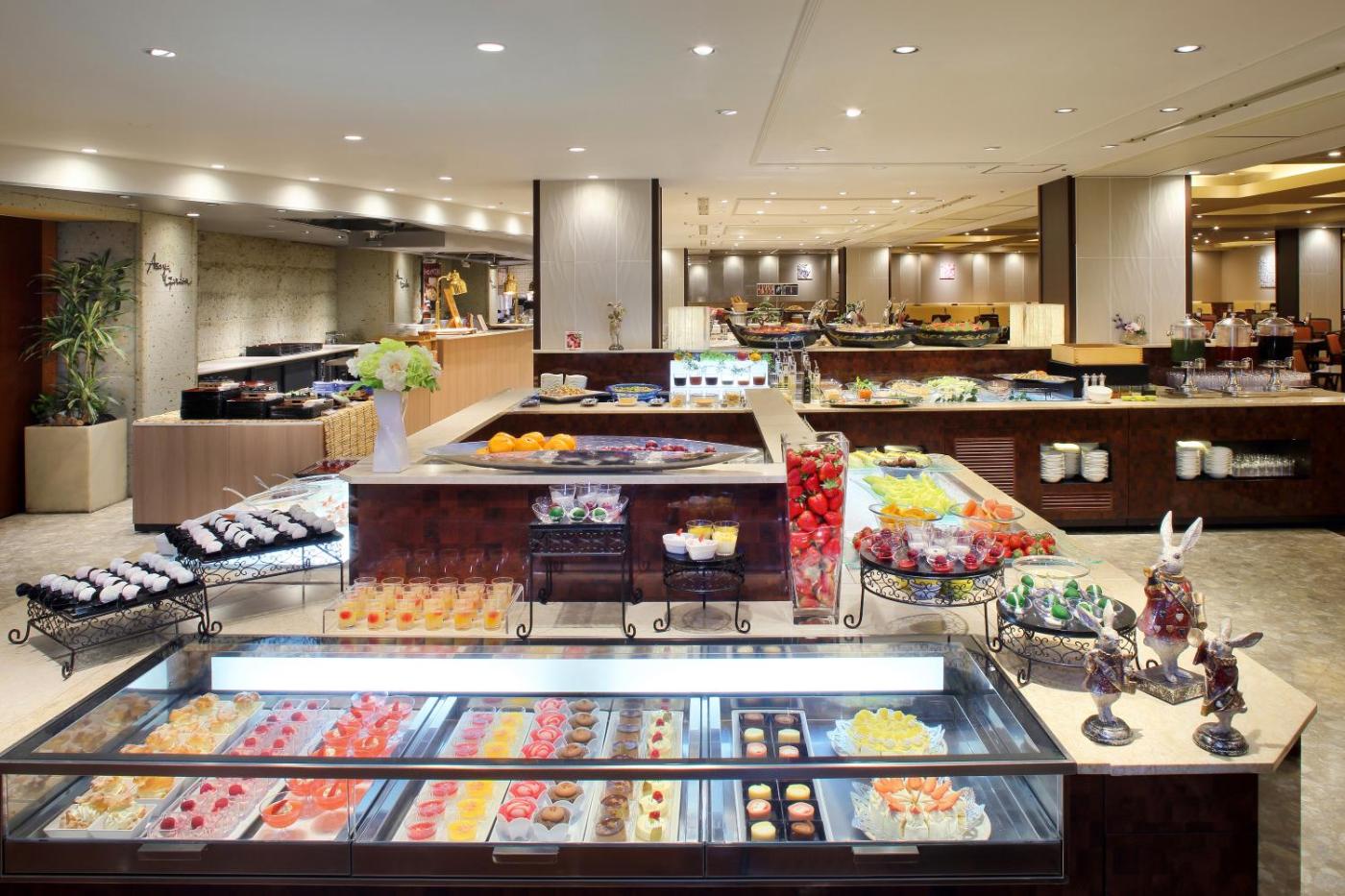 A buffet is served at one of the on-site restaurants. The dinner buffet serves about 80 various dishes ranging from Chinese, Japanese and Western meals, while the breakfast buffet provides about 60 variations, mainly Japanese and Western dishes.