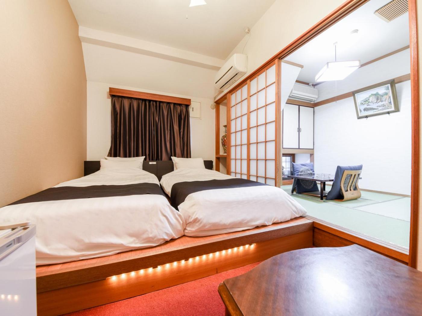 Japanese-Style Twin Room. Fitted with tatami (woven-straw) flooring and traditional futon bedding, this room comes with a flat-screen TV, a fridge and an electric kettle with green tea. A hairdryer and toiletries are included in the en suite bathroom. ;