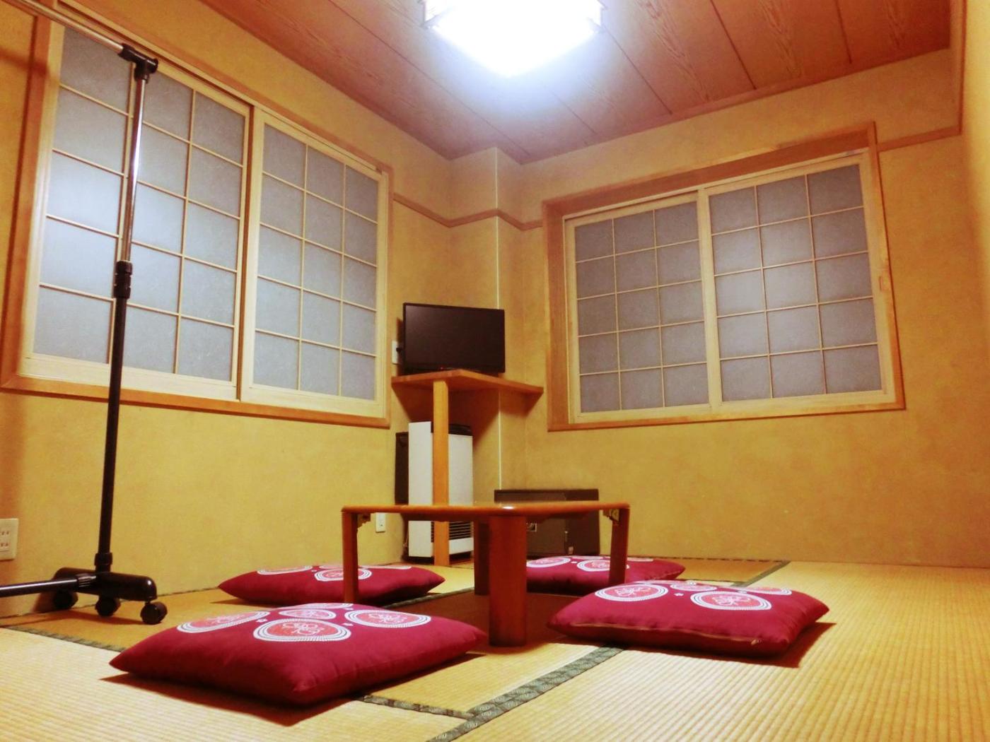 Japanese-Style Family Room with Shared Bathroom. Fitted with tatami (woven-straw) flooring and traditional futon bedding,rooms come with heating facilities, a TV, a safe and a seating area. The surrounding mountains can be viewed from the rooms. Bathrooms and toilets are shared with other guests.