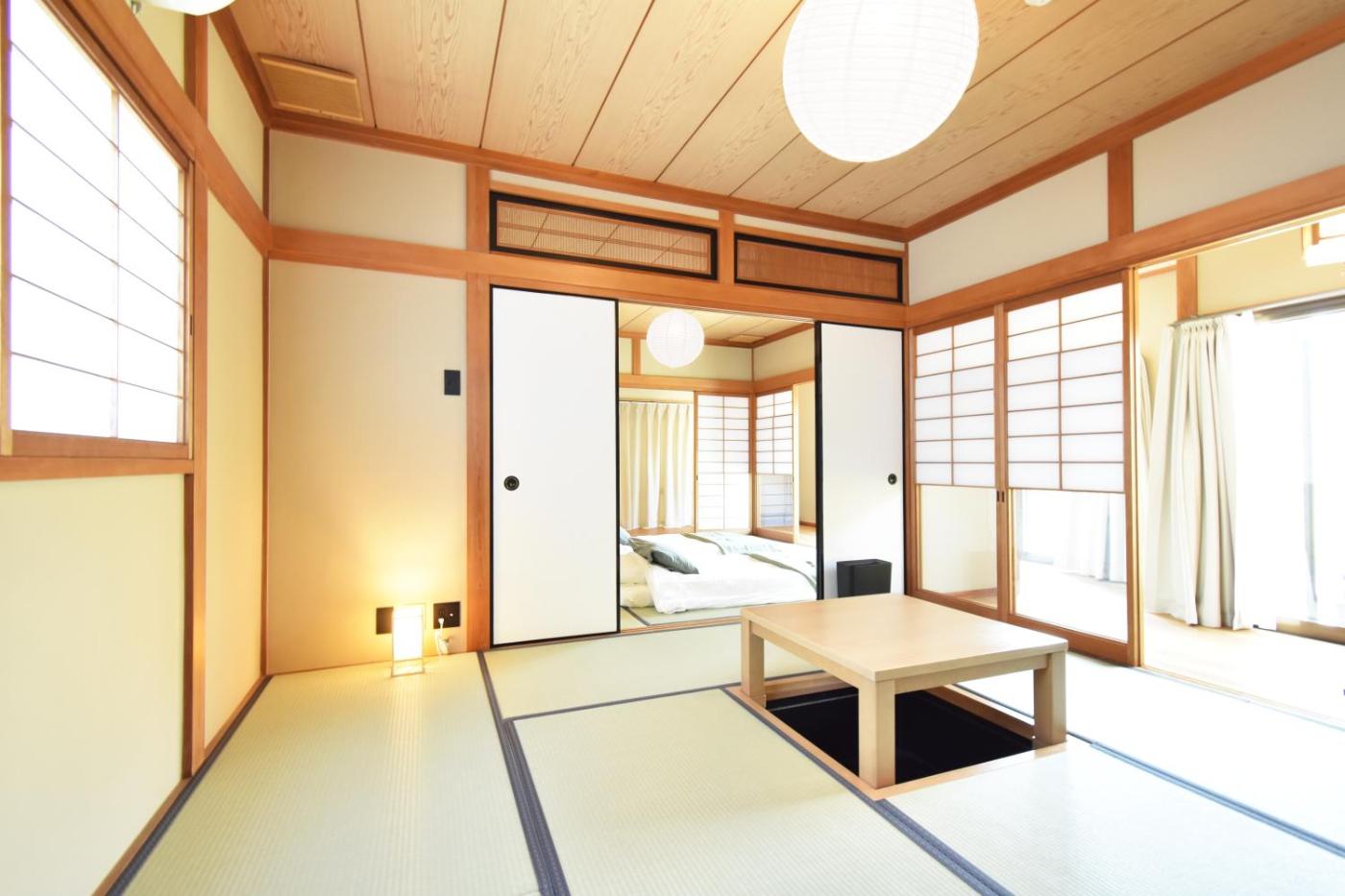Villa. Featuring a private entrance, this air-conditioned villa is comprised of a kitchen, 4 bedrooms and 1 bathroom with a bath and a shower. In the well-fitted kitchen, guests will find a stovetop, a refrigerator, kitchenware and a microwave. The villa offers a washing machine, tatami, a tea and coffee maker, a flat-screen TV, as well as a quiet street view. The unit offers 4 beds and 6 futons.