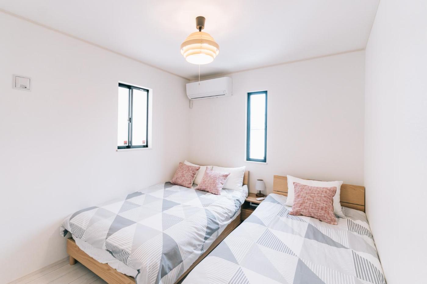 Four-Bedroom House. Featuring a private entrance, this air-conditioned holiday home is comprised of 1 living room, 4 separate bedrooms and 1 bathroom with a bath and a hairdryer. Guests can make meals in the kitchen that comes with a stovetop, a refrigerator, kitchenware and an oven. Boasting a balcony, this holiday home also offers a washing machine, tatami and a flat-screen TV. The unit offers 6 beds and 2 futons.