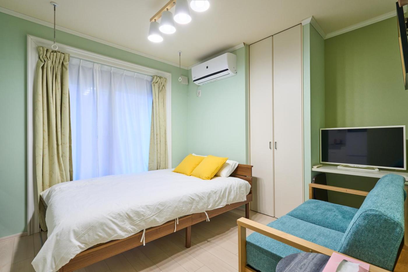 One-Bedroom Apartment. The air-conditioned apartment has 1 bedroom and 1 bathroom with a bath and a shower. In the fully equipped kitchen, guests will find a stovetop, a refrigerator, kitchenware and a microwave. The apartment offers a washing machine, a dining area, an electric kettle, a sofa, as well as a flat-screen TV. The unit has 1 bed.