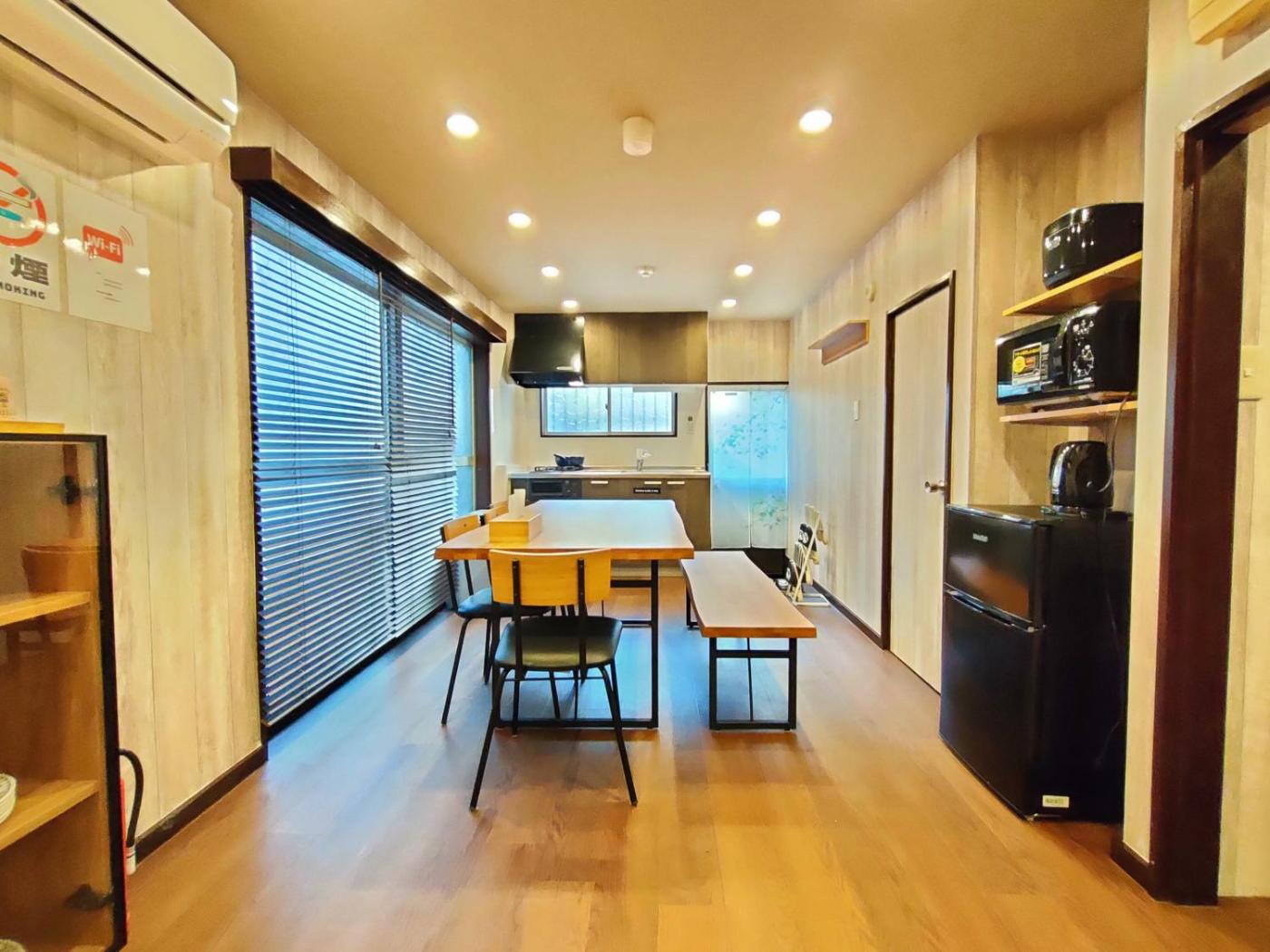 Family Suite. Featuring a private entrance, this air-conditioned suite consists of 1 living room, 2 separate bedrooms and 1 bathroom with a bath and a shower. Guests can make meals in the kitchen that is equipped with a stovetop, a refrigerator, kitchenware and a microwave. The spacious suite provides a washing machine, tatami, a dining area, a wardrobe and a flat-screen TV with streaming services. The unit offers 2 beds and 3 futons.