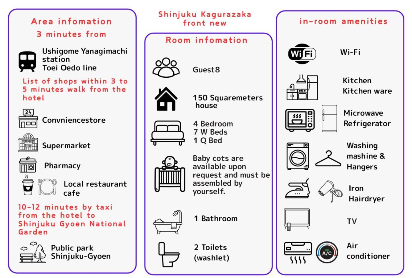 Located in Tokyo, 200 metres from Horoku Inari Shrine and 200 metres from Kyoou-ji Temple, Premier suite New Shinjuku Kagurazaka front provides spacious air-conditioned accommodation with a balcony and free WiFi. This recently renovated apartment is located 600 metres from Tamon-in Temple and 700 metres from Kantsu-ji Temple. The property is non-smoking and is situated 500 metres from Joei-ji Temple.