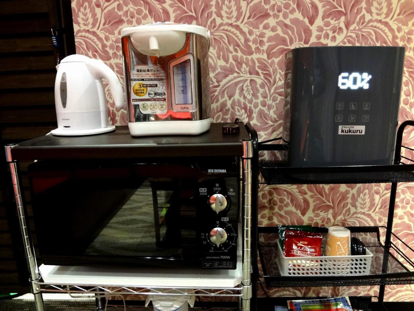 Guest rooms in the capsule hotel are equipped with a kettle. Each room comes with a shared bathroom with a bidet, free toiletries and a hairdryer. At Guesthouse kukuru rooms come with air conditioning and a flat-screen TV.
