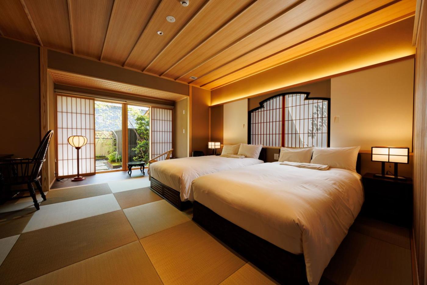 Twin Room with Private External Bathroom. The private open-air bath is a top feature of this twin room. The spacious twin room features air conditioning, tatami, a terrace with garden views as well as a private bathroom boasting a bath. The unit has 2 beds and 2 futons. ;